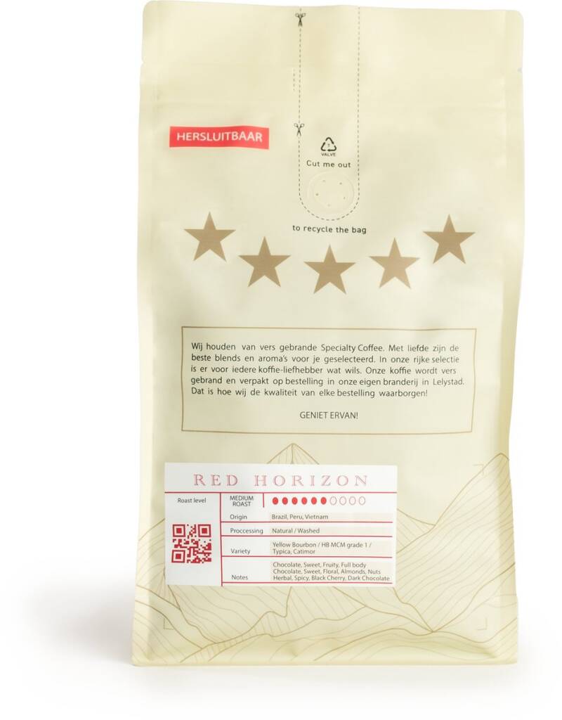 Red Horizon is een medium roast met een uitgebalanceerd en veelzijdig karakter, samengesteld uit zorgvuldig geselecteerde Arabica-bonen uit Brazilië (Yellow Bourbon), Peru (Selva Central) en Vietnam (Dalat Lam Dong). Deze blend combineert de zoete, notige tonen van Brazilië met de fruitige frisheid van Peru en de verfijnde bloemige zoetheid van Vietnam. Het resultaat is een harmonieuze en gelaagde koffie-ervaring.